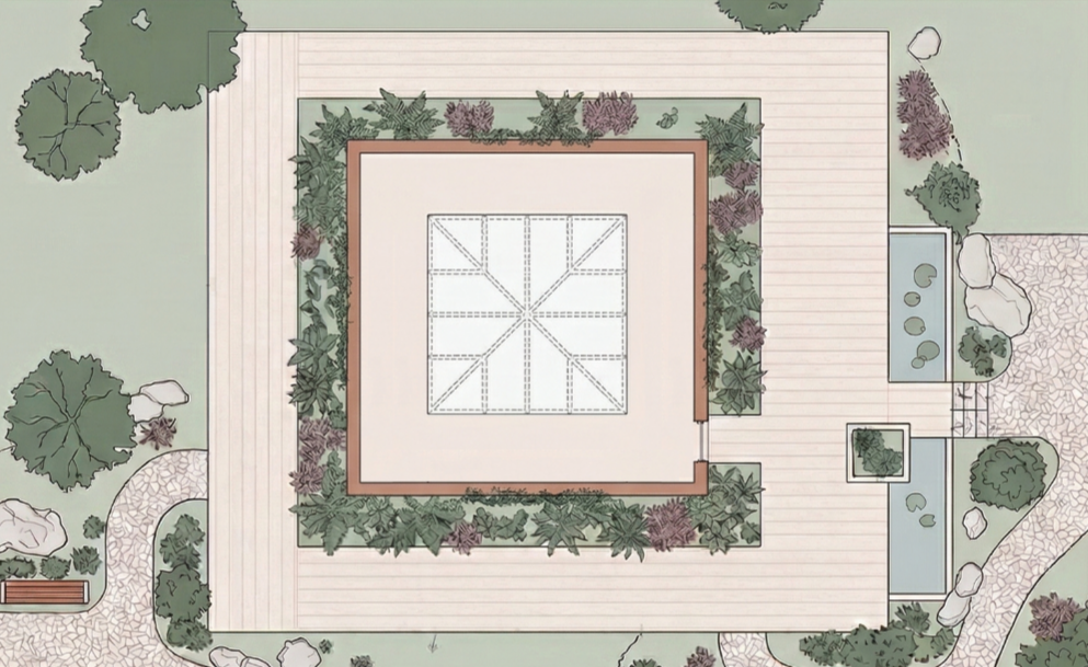 Éco-responsabilité : Intégration de matériaux géo-sourcés et d'un bassin extérieur paysager agissant comme un système naturel de récupération et de filtration des eaux de pluie.