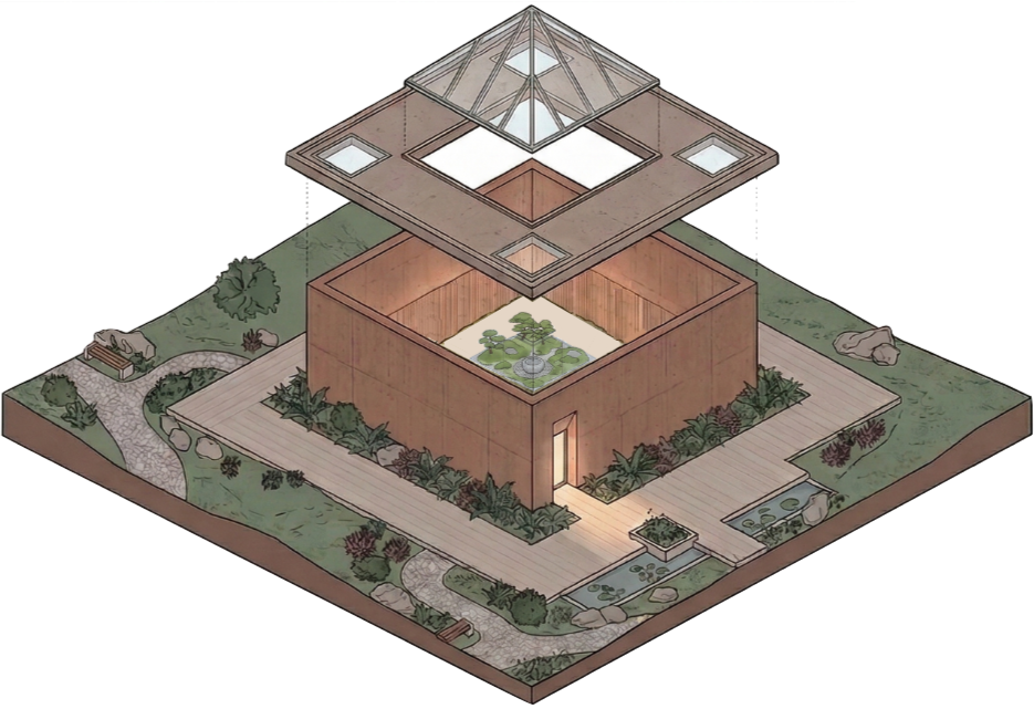 Pourtant, derrière cette façade sculpturale se cache un cœur vibrant et lumineux : un spectaculaire atrium central entièrement vitré. Ce véritable terrarium grandeur nature, abritant un jardin zen, des mousses et un point d'eau apaisant, devient le pivot de la maison. Surplombé d'une verrière pyramidale magistrale, ce puits de lumière inonde les espaces de vie et la mezzanine intime, révélant la chaleur des boiseries et l'élégance de l'escalier hélicoïdal.